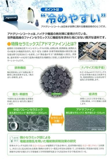 半導体の封止材等精密機器(テレビ・携帯・カメラ等)の熱対策に用いられる世界最高峰の超微粒子真球無孔質ファインセラミックス(通称:アドマファイン)を建材塗料に応用し開発された為、太陽光の近赤外線を最も効果的に乱反射させます。