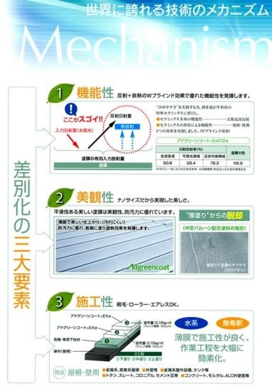 ヒートアイランド対策用に設計されたアドグリーンコートは排熱にこだわり開発された“冷めやすい”塗料です。